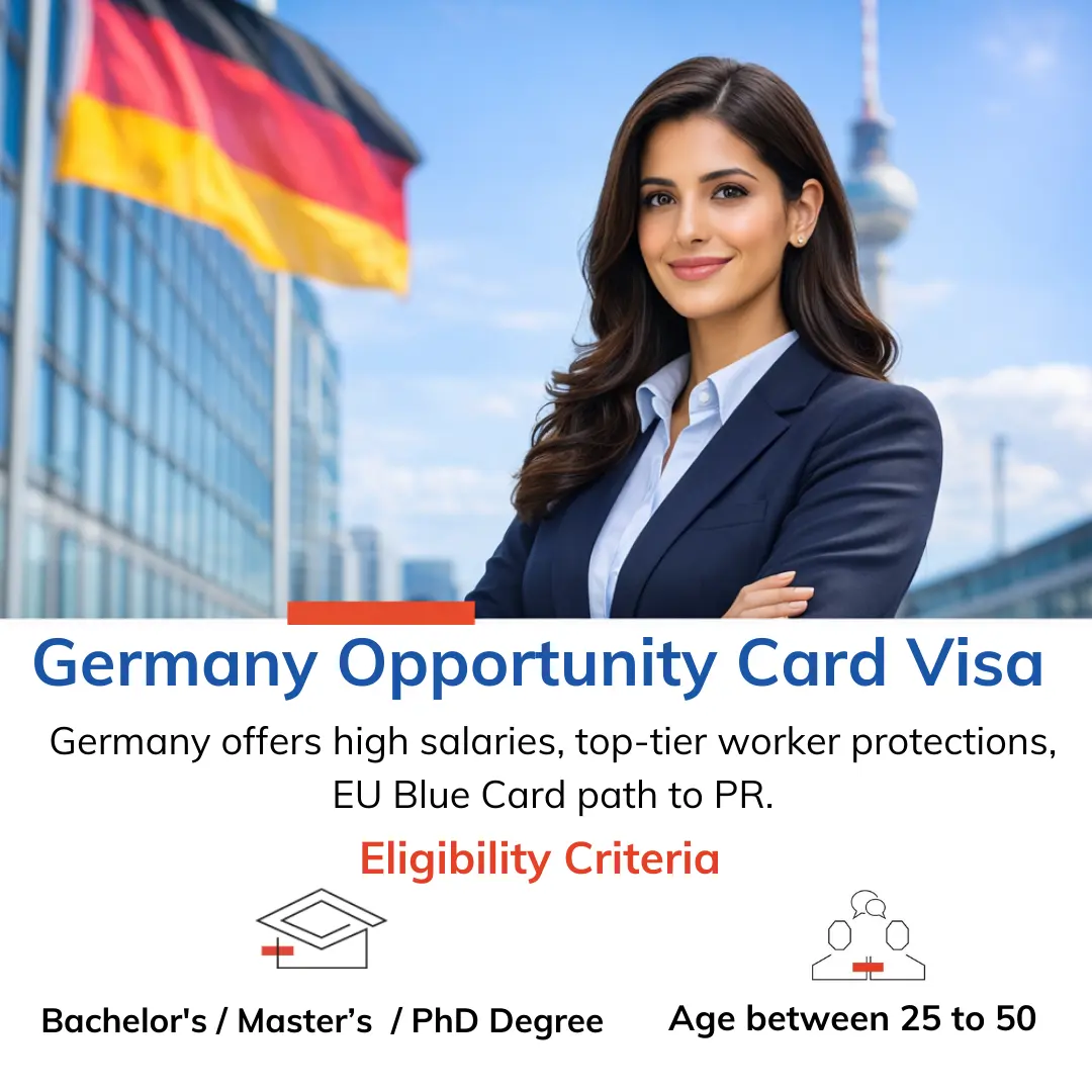Germany's new Opportunity Card lets you enter the country and start working up to 20 hours a week while job hunting and attending interviews. No sponsor needed.